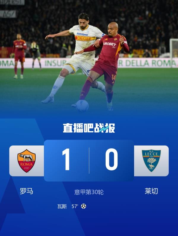 瓦斯头球制胜,罗马1-0莱切取得近四轮首胜距前四3分。