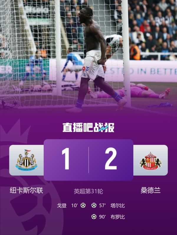 布罗比绝杀,桑德兰2-1逆转纽卡,终结各项赛事2连败;纽卡近5场各项赛事仅1胜!