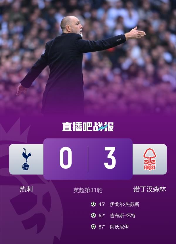 伊戈尔·热苏斯、吉布斯-怀特破门,热刺主场0-3不敌森林!热刺遭遇英超13轮不胜。