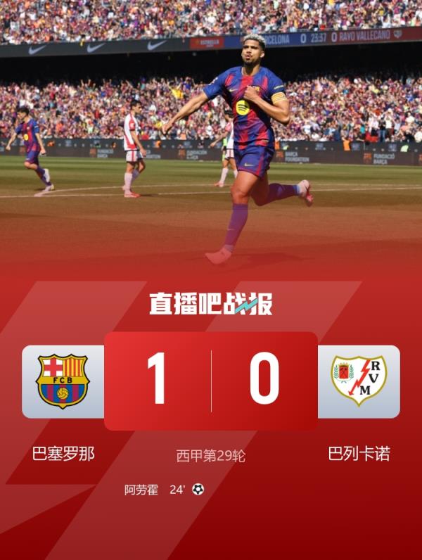阿劳霍头球首开记录,霍安·加西亚再献神扑,巴萨1-0巴列卡诺联赛五连胜先赛7分领跑。