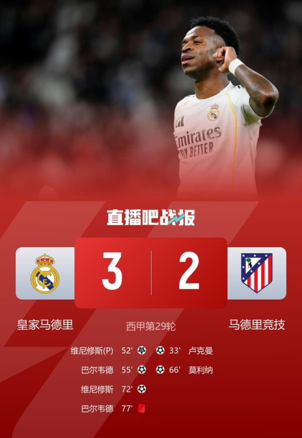 巴尔韦德破门+染红,莫利纳世界波,维尼修斯双响,最终皇马3-2马竞,各项赛事5连胜,距榜首4分。