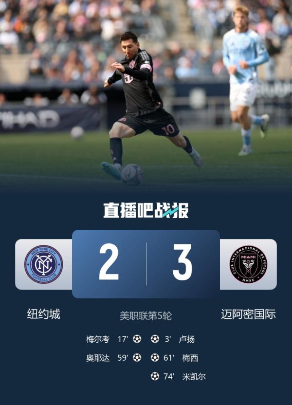 梅西任意球破门追平+生涯第901球,迈阿密国际客场3-2险胜纽约城,终结各赛事3连平。
