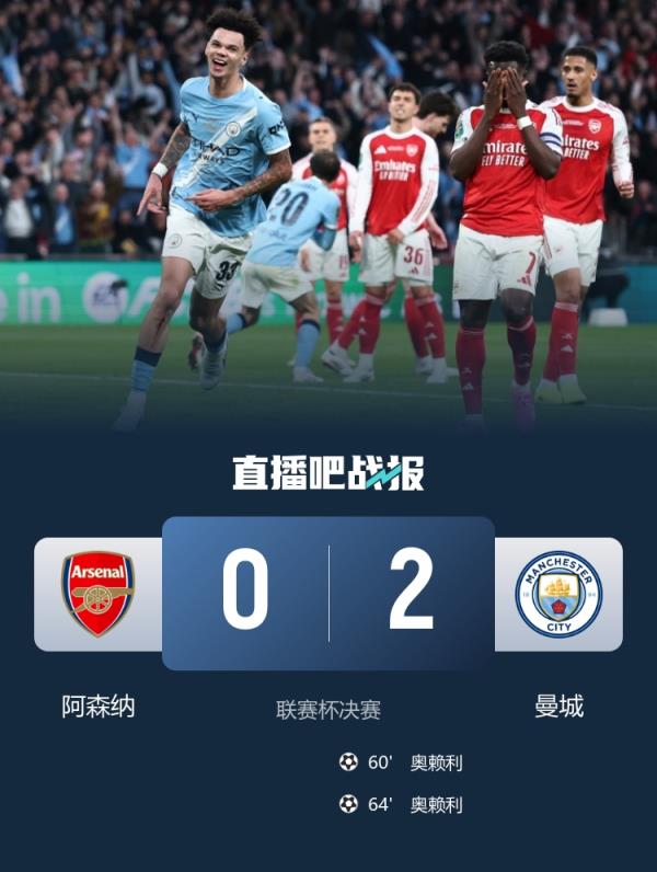 联赛杯决赛,阿森纳不敌曼城,枪手错失联赛杯冠军!阿尔特塔对瓜迪奥拉连续6场不败的纪录也被终结