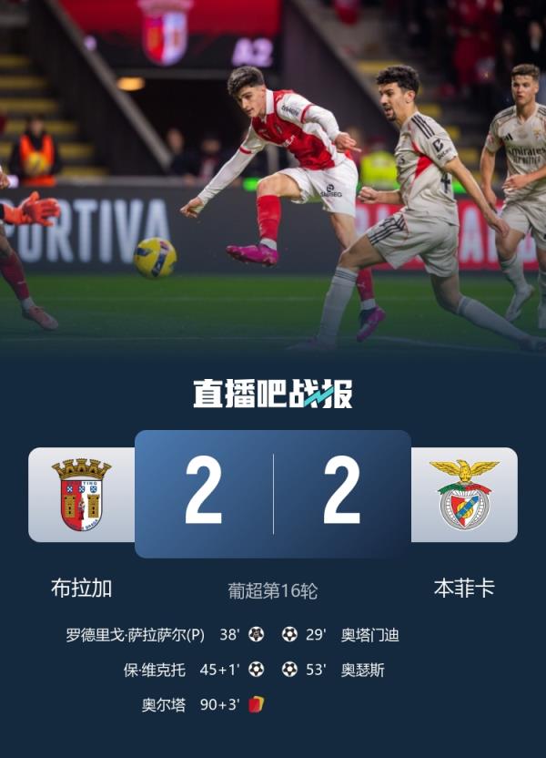 奥塔门迪破门,本菲卡客场2-2战平布拉加,各赛事4连胜终结。