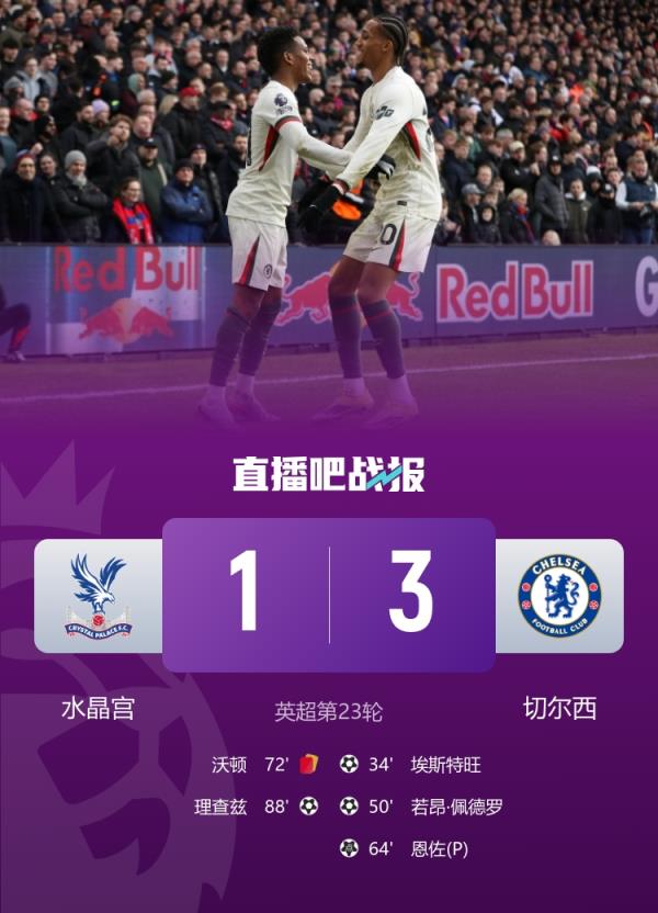 切尔西3-1水晶宫,取得各项赛事三连胜。