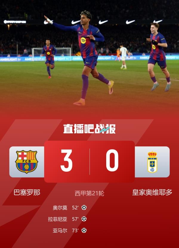 1分领跑!巴萨3-0奥维耶多 奥尔莫传射亚马尔精彩侧钩破门