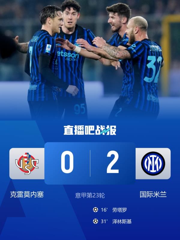 3连胜!国米2-0克雷莫内塞先赛8分领跑 劳塔罗建功泽林斯基世界波