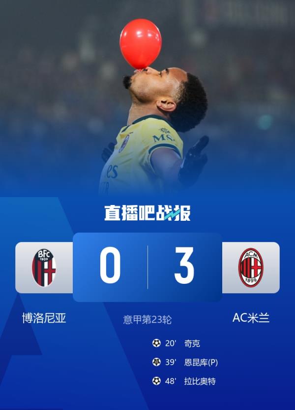 米兰3-0击败博洛尼亚,本赛季联赛对博洛尼亚完成双杀,米兰已保持22轮不败,继续排名联赛第二,距离榜首还有5分差距。