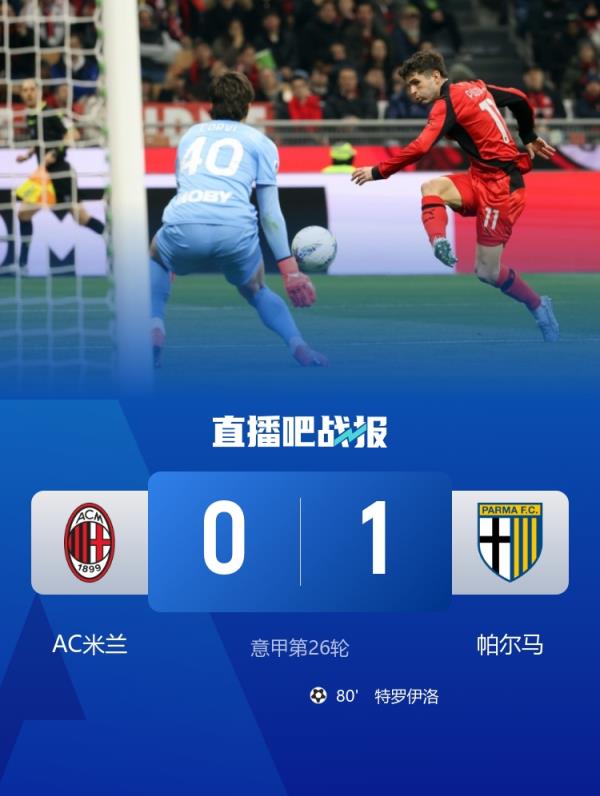 意甲第26轮,AC米兰主场0-1帕尔马,遭遇联赛第二场失利,落后榜首10分。