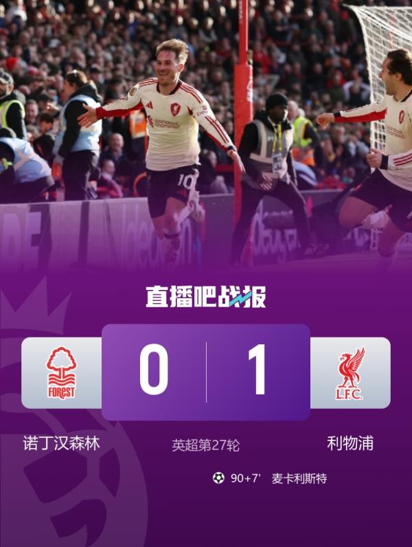 英超联赛第27轮,利物浦1-0绝杀诺丁汉森林,麦卡利斯特97分钟进球。