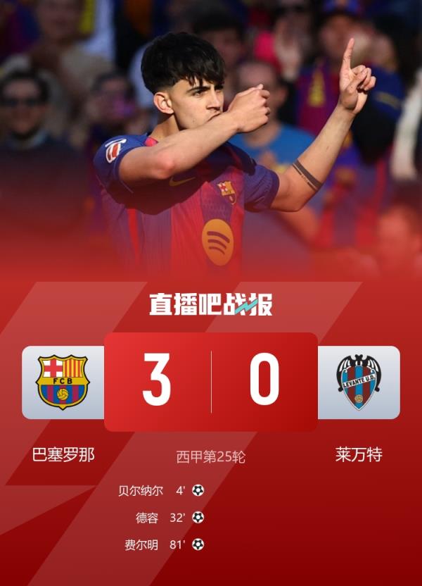 西甲第25轮,巴塞罗那3-0莱万特,贝尔纳尔、德容、费尔明进球。