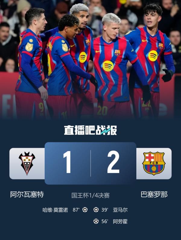 巴萨连续两个赛季进入国王杯半决赛,2019年之后首次 2月4日讯 国王杯1/4决赛,巴塞罗那2-1战胜阿尔瓦塞特,进入半决赛。数据统计显示,这是巴萨连续两个赛季进入国王杯半决赛,去年他们也进入半决赛,并最终成功夺冠。 2026/02/04