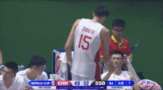 打南苏丹第三节周琦下场休息时的表情如上,而第四节他再上时分差已经到了12分