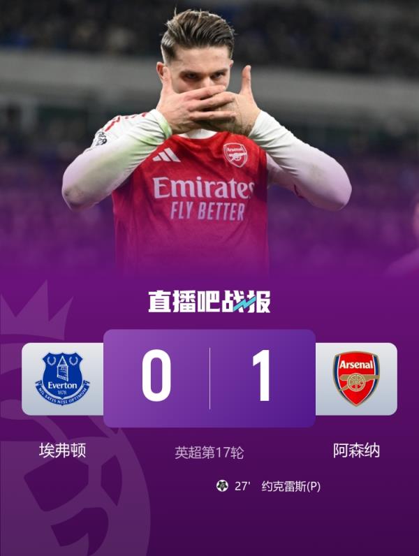 英超第17轮,阿森纳客场1-0战胜埃弗顿,约克雷斯点球制胜。