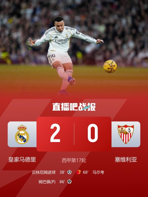 西甲联赛第17轮,皇马2-0战胜塞维利亚,贝林厄姆进球,姆巴佩点射追平C罗进球纪录。