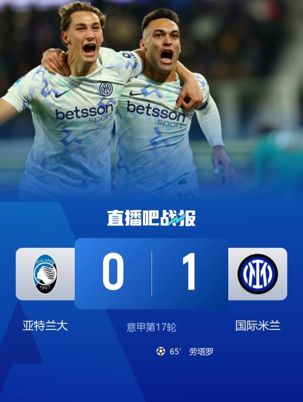 劳塔罗制胜,亚特兰大0-1国米。积分榜方面,国米36分以一分优势领跑,亚特兰大22分第九。
