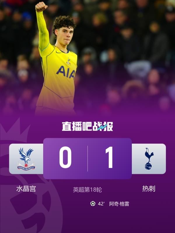 格雷头球破门,热刺1-0击败水晶宫。
