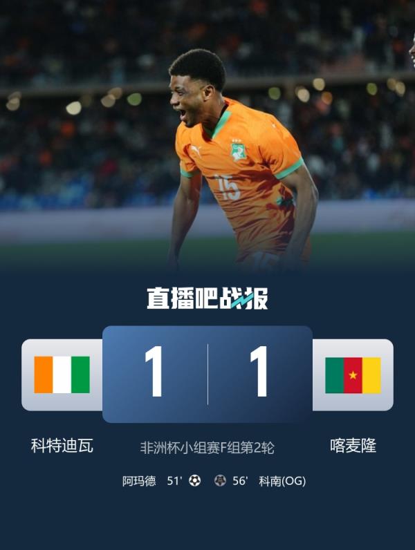 阿玛德破门,科特迪瓦1-1喀麦隆,两队握手言和,同积4分,分列小组前二。