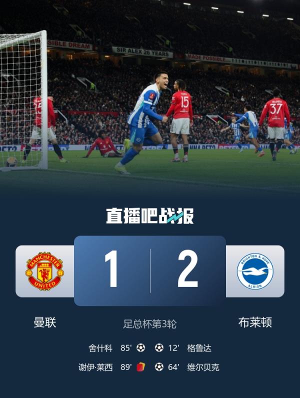 一轮游!曼联1-2布莱顿足总杯出局 维尔贝克弑旧主 弗莱彻2场0胜