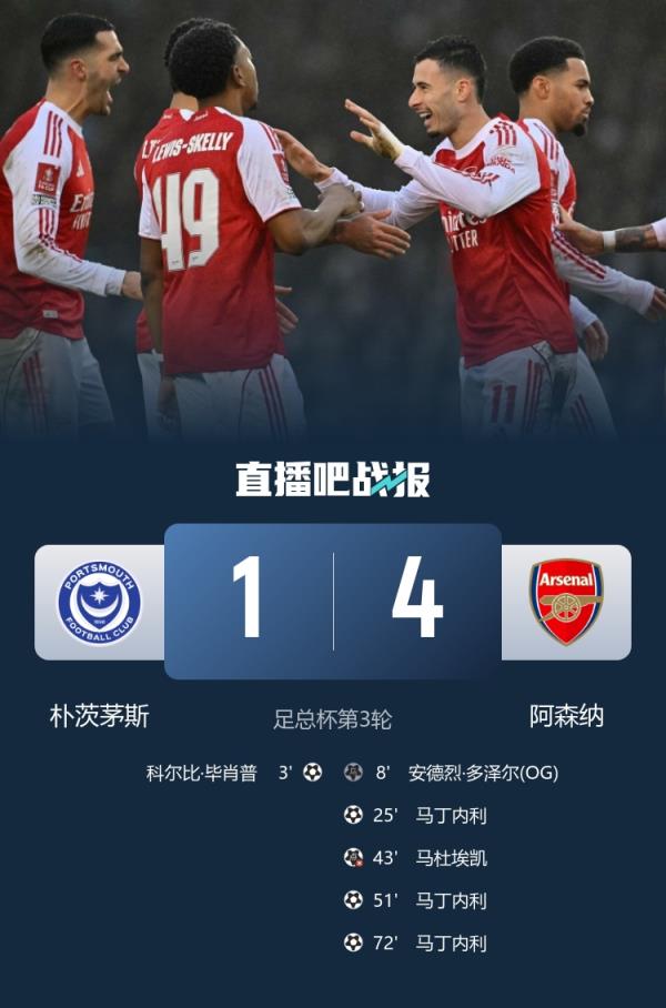 马丁内利戴帽,阿森纳4-1朴茨茅斯,晋级足总杯32强。