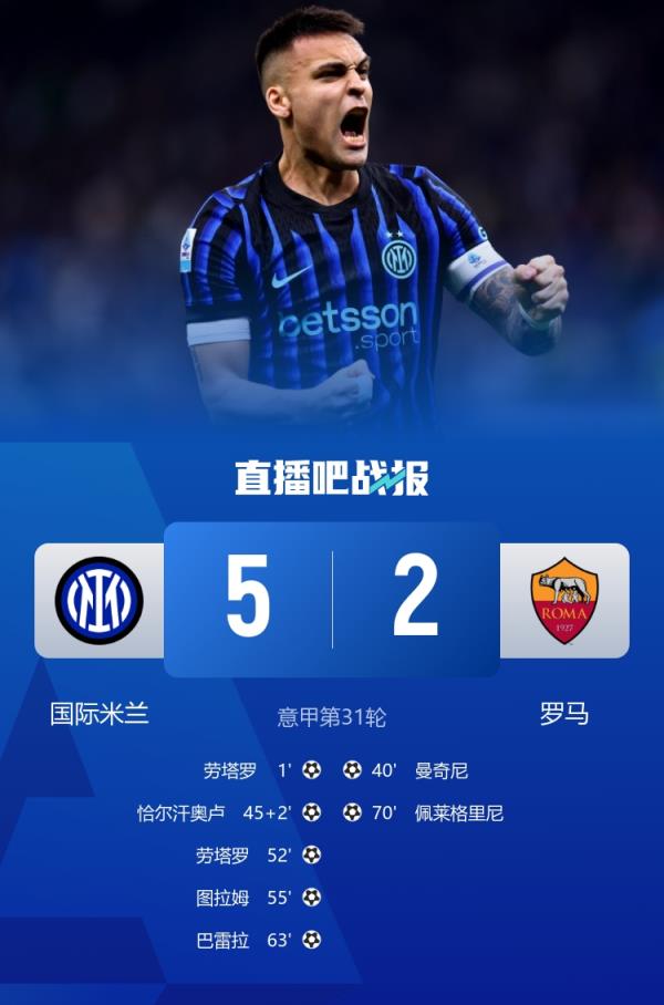 劳塔罗复出即双响,国米5-2击败罗马,先赛9分领跑意甲!